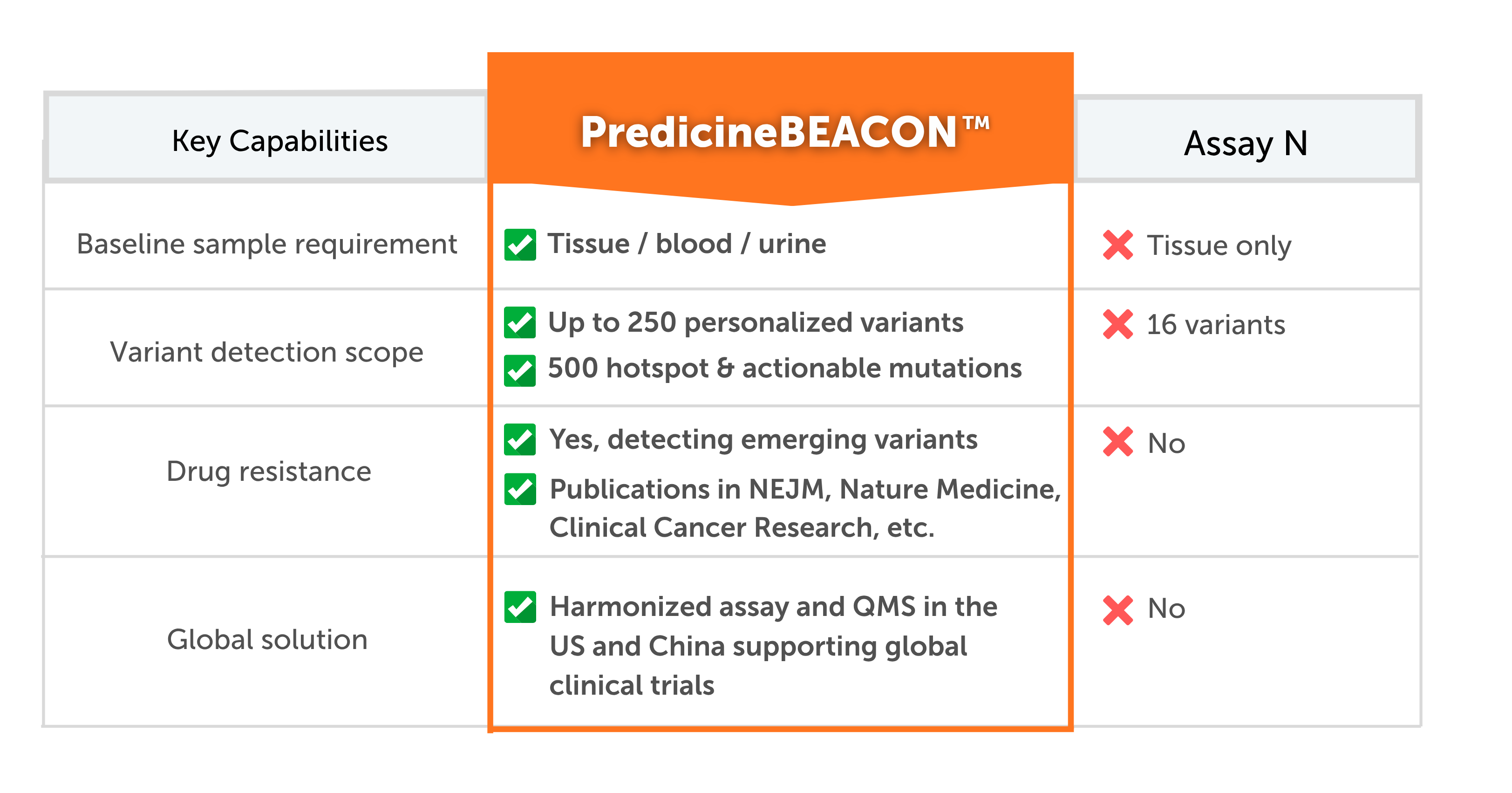 MRD detection with PredicineBEACON™ is different from conventional MRD assays because it is not limited by baseline sample availability. If available, baseline samples can be assessed using patient’s blood, urine or tissue. If a baseline sample is unavailable, monitoring the recurrence or progression of cancer can be achieved with a simple blood draw or urine sample with our tissue-agnostic approach.